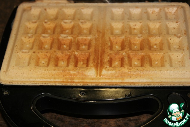 Вафля считается готовой после того как образовалась коричневая корочка. Она очень хрустящая, несмотря на то что вафля внутри мягкая и нежная. У меня на пару вафель уходило 5 минут.