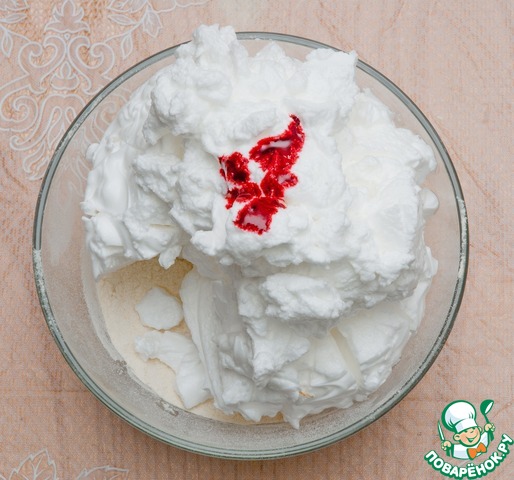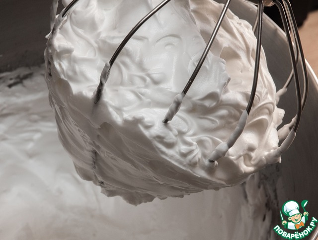 Теперь приготовим французскую меренгу: взбиваем белки на высокой скорости до появления пены и продолжаем взбивать, постепенно всыпая сахар.