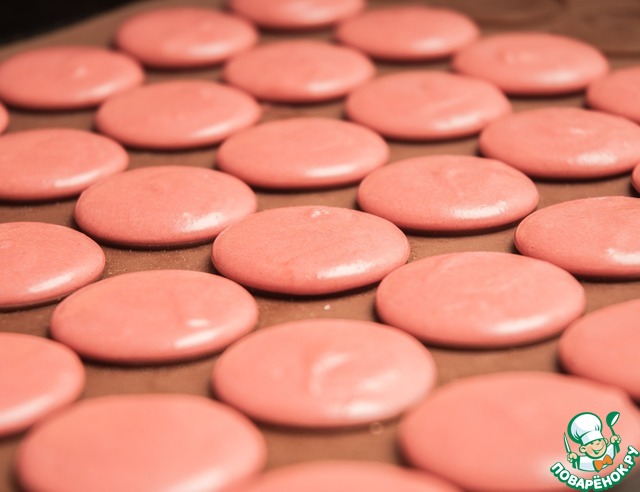 Готовую смесь перекладываем в кондитерский мешок и с помощью круглой насадки отсаживаем наши будущие макаронс на специальный коврик или на пергамент. Обязательно даем им подсохнуть в течение часа (поверхность должна покрыться легкой корочкой, к которой не прилипает палец). Затем выпекаем при 150 градусах в течение 14 - 16 минут. Даем полностью остыть и только потом отделяем половинки от коврика.