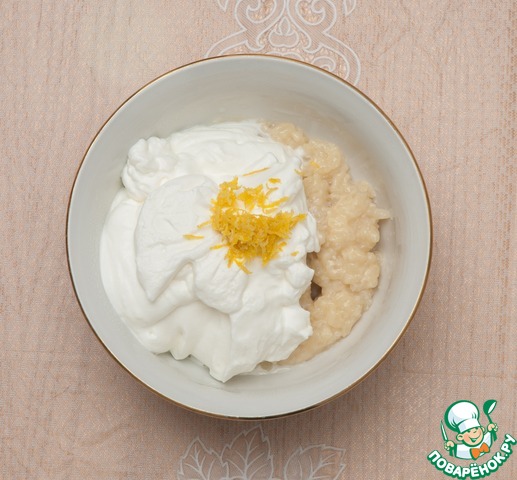 Пока рисовая часть крема остывает, взобьем хорошо охлажденные сливки, добавив ванилин. В остывший рис вводим взбитые сливки и добавляем лимонную цедру. Для большей однородности можно пробить крем в блендере.
