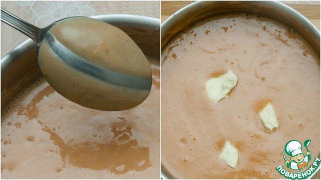 Варим на слабом огне, постоянно помешивая, смесь должна довольно сильно загустеть. Снимаем с огня и добавляем сливочное масло. Хорошо перемешиваем и даем остыть. После остывания курд еще немного загустеет. Его получается довольно много, так что смело можно уменьшать количество ингредиентов раза в 4 или использовать для других десертов.