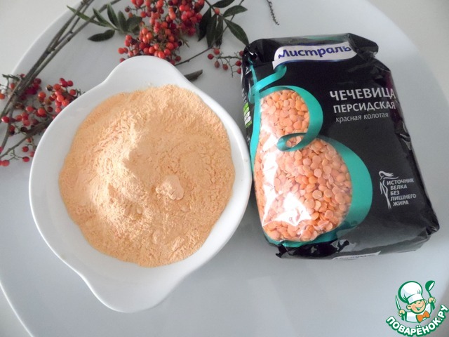 Для начала приготовить чечевичную муку, для этого нужно взять 100гр. чечевицы и перемолоть.