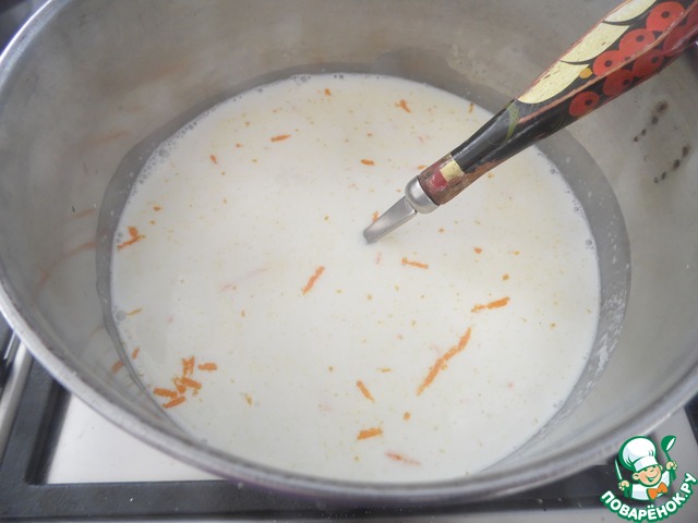 Сливки вылить в кастрюльку и добавить цедру апельсина, довести ПОЧТИ!!! до кипения.