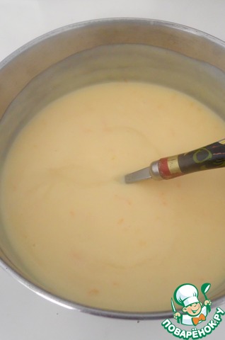 Поставить на небольшой огонь и варить ПОСТОЯННО ПОМЕШИВАЯ~! до легкого загустения, примерно 5-7 минут/ (крем должен быть консистенции жидкой сметаны) Крем не нужно остужать