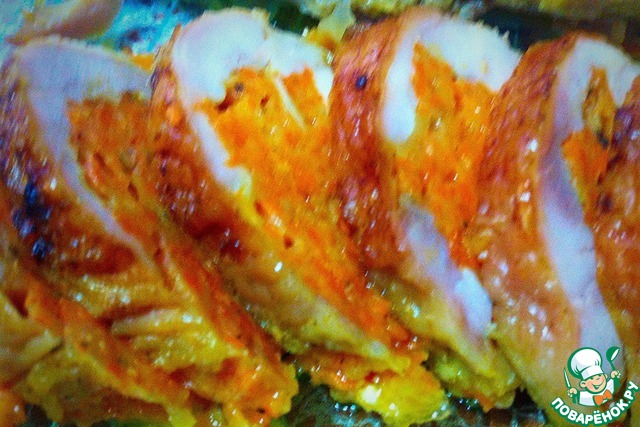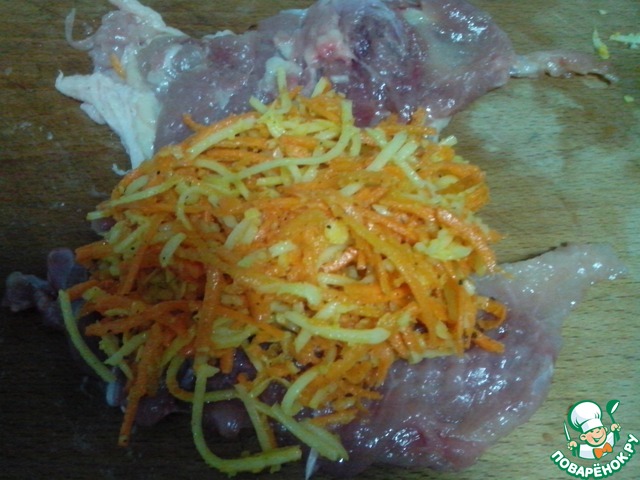 Положить окорочок кожей вниз, сверху на мясо выложить 3 ст. л. начинки ( можно и больше, кому как нравится).