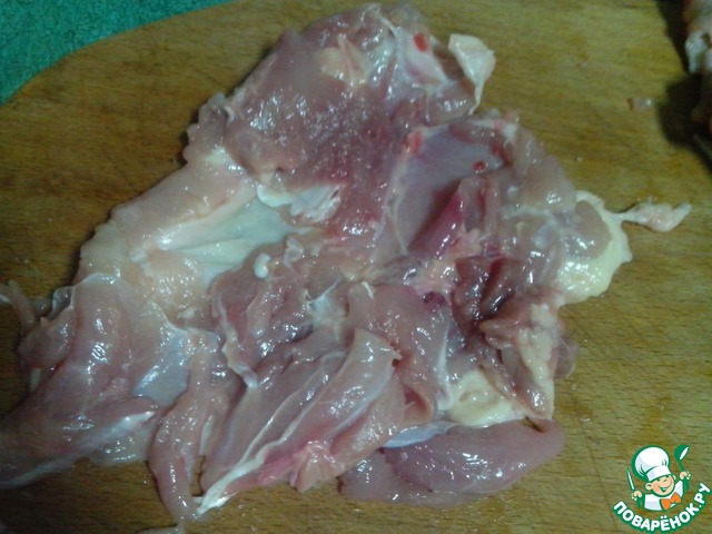 Окорочка обмыть, просушить салфеткой и аккуратно убрать все кости. Остаётся только мясо с кожей. Кожу желательно не порвать.