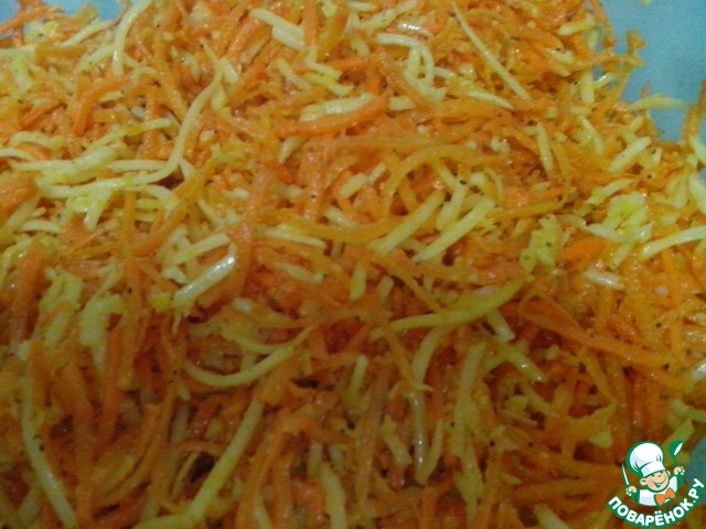 Займемся начинкой. Морковь и сыр потерпеть на терке, лучше если это будет тёрка для корейской моркови. Так будет эстетичней и морковь не даст много сока. Я потеряла все на кухонном комбайне. Чеснок выдавить через пресс и добавить к смеси моркови и сыра. Поперчить, посолить и добавить растительное масло. Все перемешать. Напоминает наша начинка салат "Огонек". Перца и чеснока можно меньше, если будут есть дети или вы не любите острое. Но тогда не будет такого контраста вкусов. Потому что сладкая морковь в сочетании соленого сыра и остроты перца и чеснока придаёт особую пикантность этому блюду!