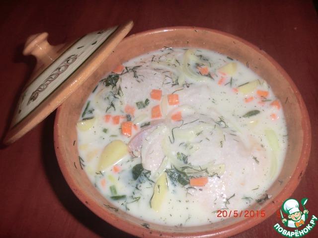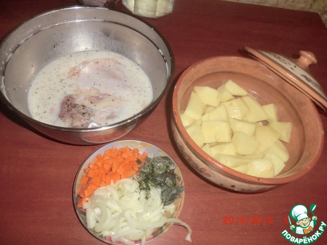 В глиняный горшочек выложить картофель, лук и морковь. Сверху выложить бёдрышки, присыпать зеленью и залить всё кефиром (чтобы покрыло). Добавить специи по вкусу. Тушить в духовке до готовности.