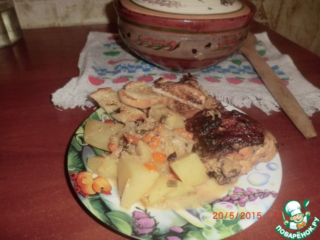 | На сайте много похожих рецептов, но хочу обратить внимание на закваску, которая придаёт блюду особый вкус. Получается нежное мясо с кисло-сладким картофелём. |
