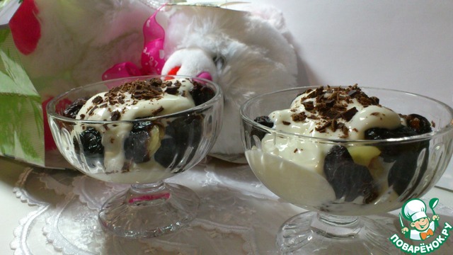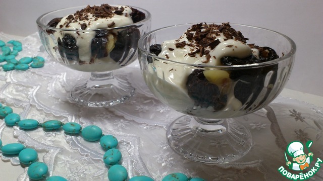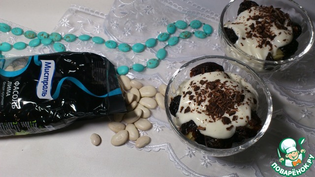 Сметану смешать с оставшимся сахаром (можно увеличить или уменьшить количество в зависимости от вкусовых предпочтений). В креманки выложить чернослив с фасолью, полить сметанным кремом. Слои можно повторить несколько раз. Сверху украсить тертым шоколадом.