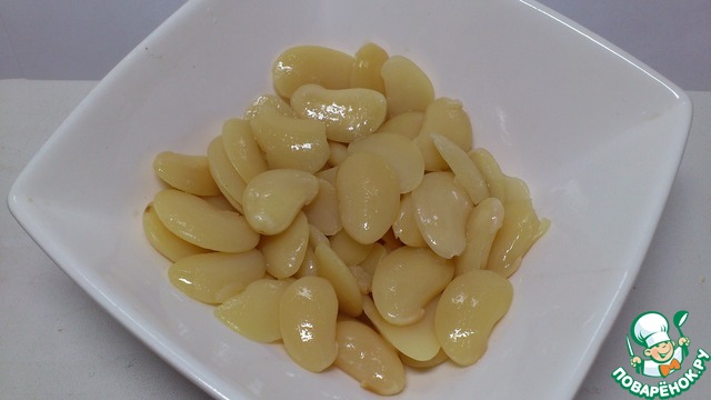 Фасоль замочить на ночь в воде. У меня она стояла около 8 часов и по весу увеличилась ровно вдвое. Затем почистить от кожицы, отварить с добавлением 1 чайной ложки сахара не больше часа. Фасоль должна сохранить свою форму, но остаться слегка хрустящей, похожей на миндальные лепестки.