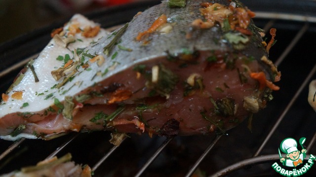 У меня сковорода-гриль. Не забываем подлить воду в поддон и смазать маслом решетку. Огонь средний. Минут 7-10 с одной стороны и 5-7 с другой.