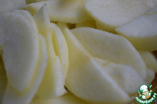 Яблоки помыть, очистить от кожуры, разрезать и удалить семенную коробку. Нарезать тонкими дольками.
