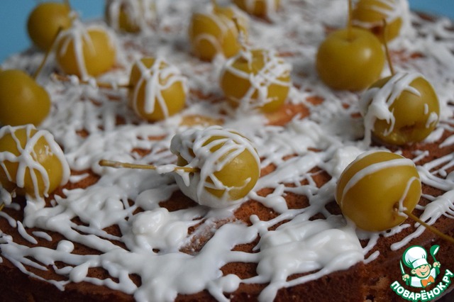 Я полила пирог белой готовой глазурью и украсила вот такими симпатичными яблочками- малышами ( консервированными, из банки )