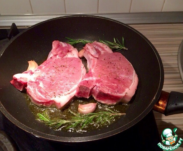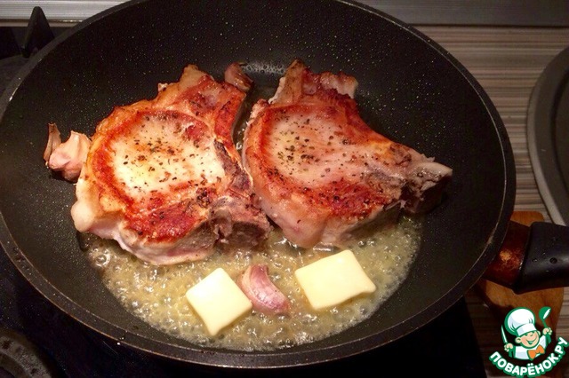 С появлением корочки переворачиваем, кладём сливочное масло. Слегка наклоняем сковороду и поливаем на отбивные. Так мы ускоряем процесс приготовления, а мясо остаётся сочным.