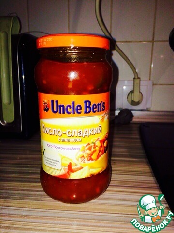 Затем я беру этот кисло-сладкий соус и разогреваю его. Если вы не можете найти такой, и, если вы хотите, я могу сделать пошаговый рецепт такого соуса.