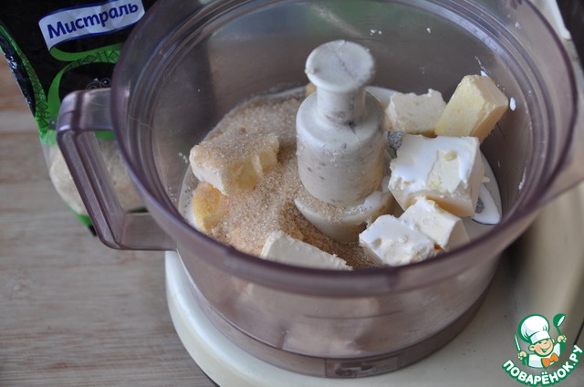 В чашу кухонного процессора кладём порезанное сливочное масло комнатной температуры, наливаем жирные сливки, кладём сахар коричневый универсальный от "Мистраль".