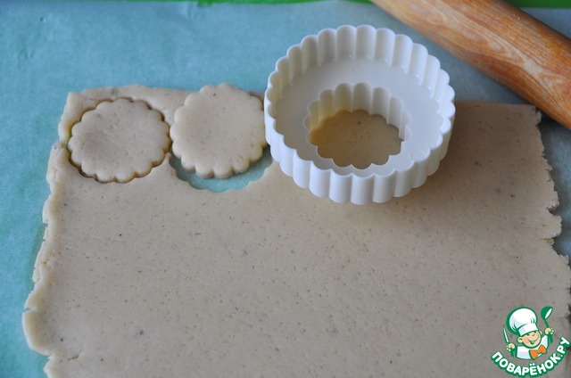 Готовое тесто для удобства делим пополам, раскатываем между листами пергамента в пласт толщиной 3 мм, с помощью любой удобной выемки вырезаем заготовки печенья.