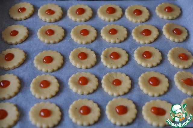 В углубление в печенье кладём по 1/8 чайной ложки джема. У меня получилось 60 штук.
