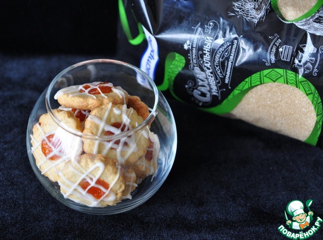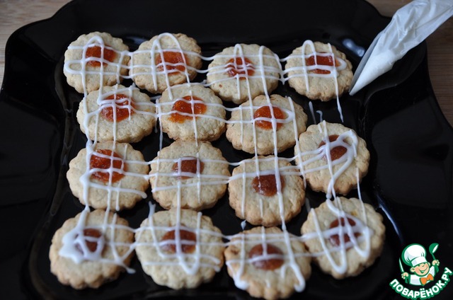 Печенье получается в меру сладким, если вам мало сладости, то печенье можно покрыть глазурью, а заодно украсить его. Для этого тщательно смешиваем белок с сахарной пудрой, добавляем лимонный сок, растираем лопаткой.