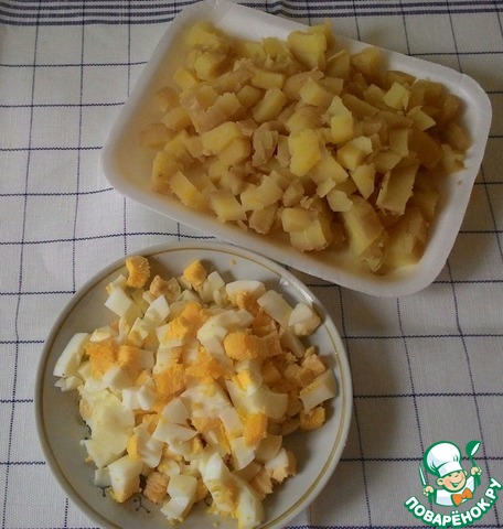 Отварной картофель и яйца почистить, нарезать мелким кубиком.
