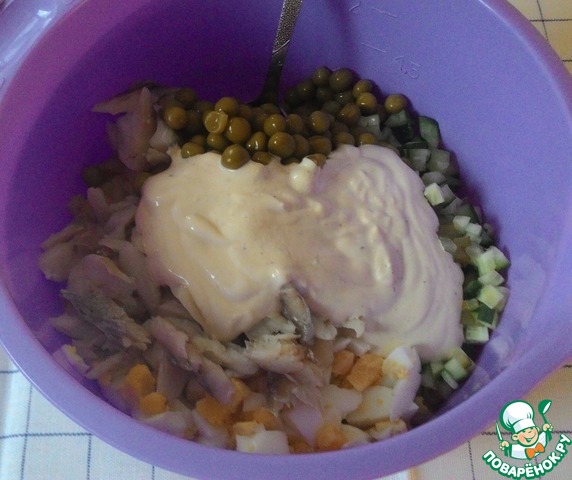 | Этот вариант всем известного салата, родился из-за отсутствия в холодильнике колбаски и мяса. А была там рыбка отварная. Супруг, отведав предложенное блюдо, и узнав ингредиенты, сказал:"Ты моя морячка! Рыбу и в оливье пристроила!" Так и назвала я салатик. Попробуйте, может Вам понравится такой вариант! |