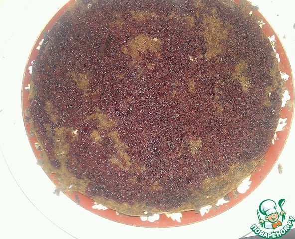 Нижний корж кладем на блюдо и хорошо пропитываем вишневым сиропом.