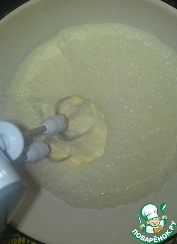 Теперь взбиваем сливки. Постепенно, по одной ложке добавляем сахарную пудру.