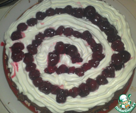 Продолжаем собирать торт. Кладем второй корж. Пропитываем сиропом. С помощью кондитерского шприца выдавливаем сливки в форме улитки. В образовавшуюся ложбинку выкладываем вишни.