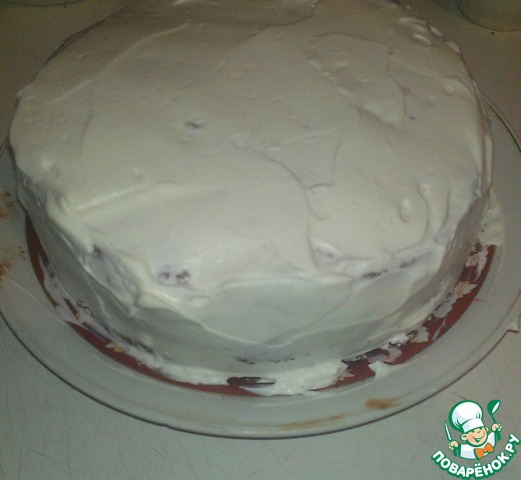 Пропитываем сиропом третий корж с той стороны, которой будем накрывать второй корж, и обмазываем сливками. Накрываем торт, обмазываем верх и бока оставшимся кремом.