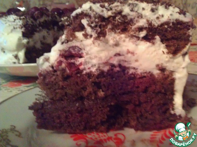 Такой тортик в разрезе! Шоколад, вишни и много-много сливок!! Мммм..!!! Специально для Вас отрезала кусочек не дождавшись мужа! Приятного аппетита!