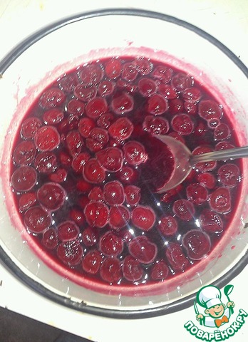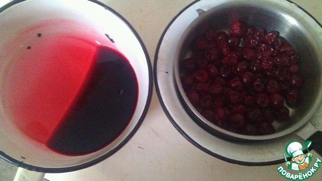 Переложить вишни (у меня замороженные) в друшлаг, а под него какую-то емкость, что бы туда истек сок с вишен. Оставить вишни до полной разморозки (я сделала это с вечера и оставила в холодильнике). Должно получиться примерно 170мл сока. Если сока не достаточно, можно добавить воды. Всыпать в сок сахар, поставить на огонь, прокипятить несколько минут.