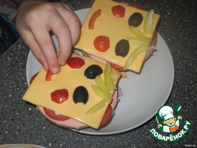Сверху укладываем пластины сыра, делаем из помидора "щечки" и "ротик", из маслин "глазки", а из перчика "волосики". Ставим бутерброды в микроволновую печь на 1 минуту при макс.мощности.
