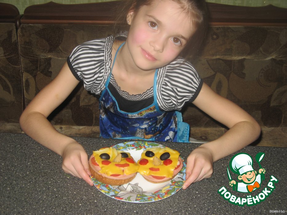 | Это дебют моей доченьки. Она решила, что уже и ей пора "выставлять"рецепты, и начала с того, что будет сама готовить себе на завтрак бутерброды. Идею приготовления подсмотрели в детском журнале"АБВГДЕйка" и немного изменили продукты. |