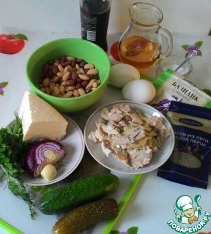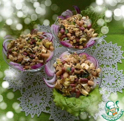 Смешать все ингридиенты в миске, полить заправкой, еще раз аккуратно перемешать. Проверить на соль. Разложить по салатницам, украсив салатом, луком или зеленью.