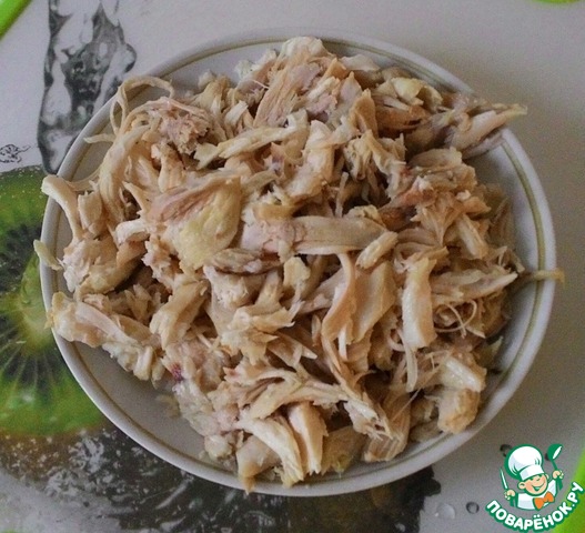 Отваренное или запеченное куриное мясо разобрать на небольшие волокна.