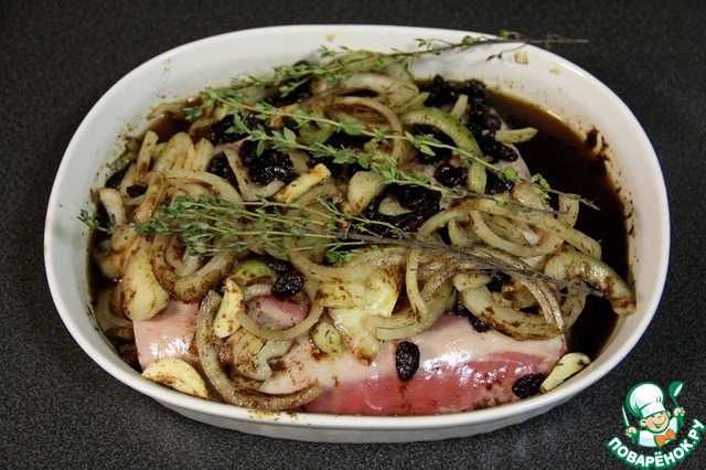 Поливаем сверху приготовленным маринадом, кладем веточки тимьяна, закрываем фольгой и ставим в холодильник на 1,5 - 2 часа мариноваться.