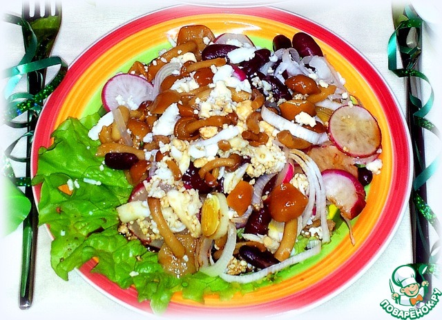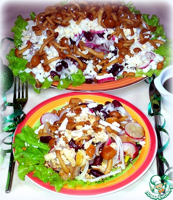 Из банки с опятами вылила маринад и высыпала их на измельчённые яйца. Салат не заправляла.