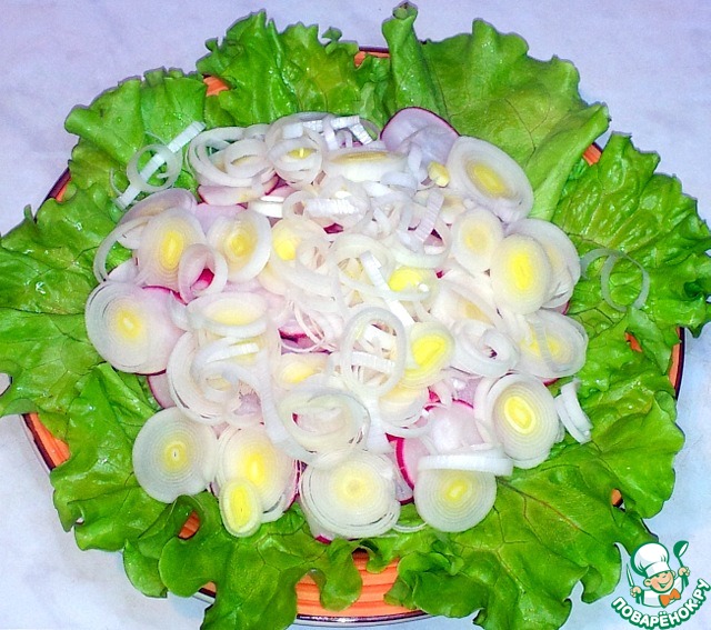 Редис нарезала тонко кольцами и выложила горкой в центр блюда.