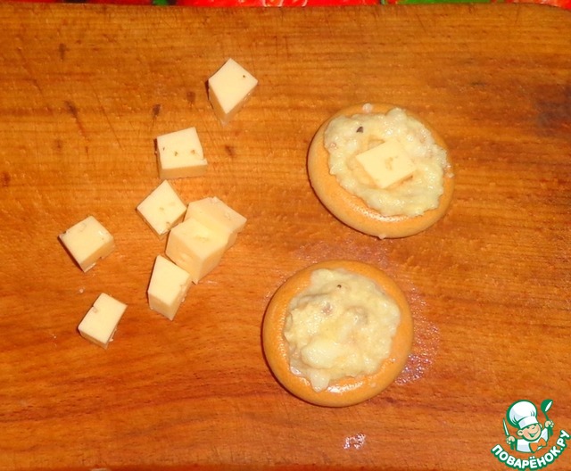 Сыр порезать небольшими кубиками. Выкладываем в сушки немного начинки и вдавливаем в нее кусочек сыра. Сыр обязательно спрятать начинкой.