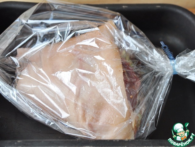 Кладём фаршированную рульку в пакет для запекания, запаковываем. Кладём в холод на 1 час мариноваться.
