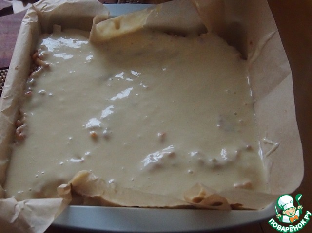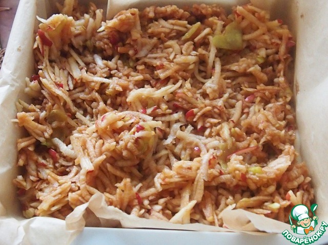 Форму 20Х20 сантиметров застелить бумагой и выложить на дно половину теста. Сверху разложить яблоки.