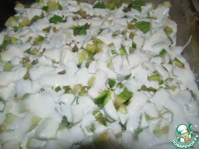 Мелко нарежьте лук, чеснок порубите, без центрального стержня, кабачки нарежьте средним кубиком и обжарьте в масле сначала лук и чеснок до легкого зарумянивания, затем очень недолго кабачки, посолите и тертый мускатный орех по вкусу. Переложите эту очень ароматную смесь в жаропрочную форму.