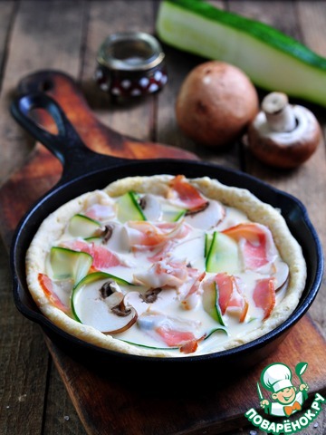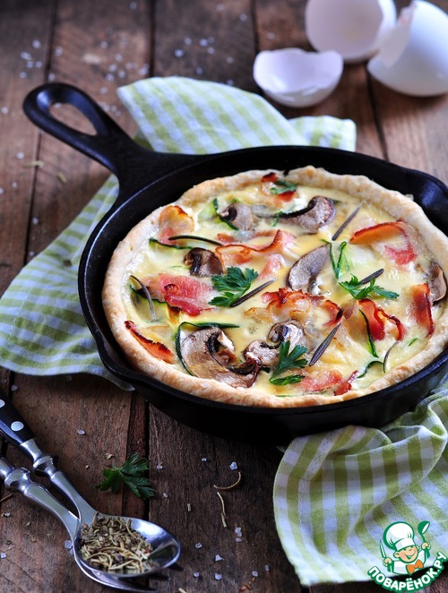 На остывшее тесто вылить сливочную заливку, выложить цуккини, грибы, бекон. Слегка посыпать розмарином или прованскими травами. Выпекать при 180* еще 15-20 минут. При подаче посыпать свежей зеленью.