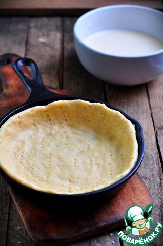 Выложить тесто в форму для запекания (20 см), наколоть вилкой и отправить в духовку при 180* на 15 минут. Готовую основу нужно немного остудить.