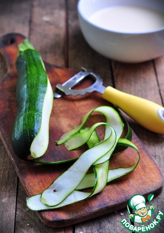 Овощи помыть, обсушить. Цуккини нарезать овощечисткой тонкими ломтиками. Внутреннюю часть с семечками выбросить. Нарезать грибы, если полоски бекона слишком длинные, их тоже следует нарезать.