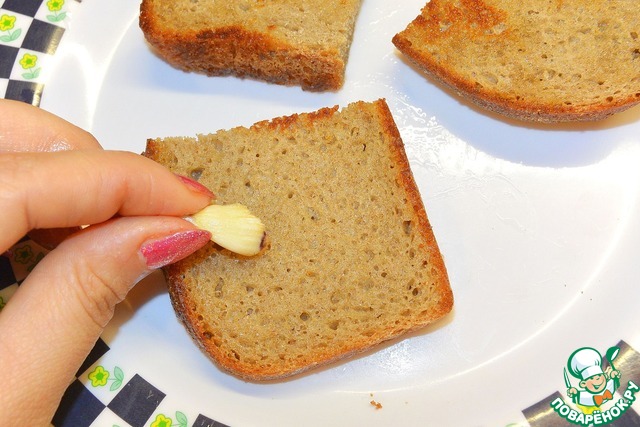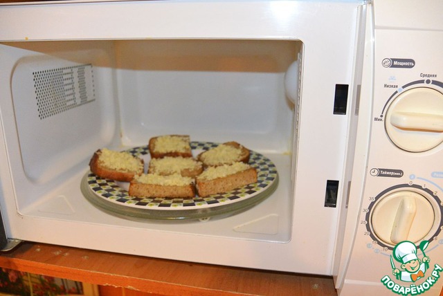 Запечь гренки в СВЧ в течении 1 минуты, чтобы расплавился сыр.