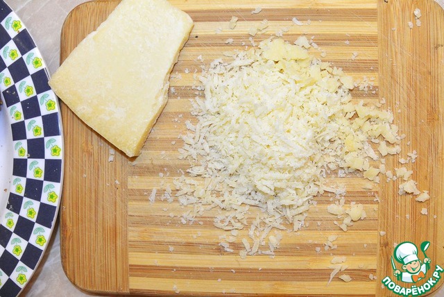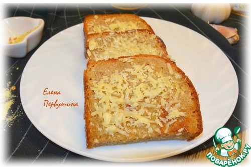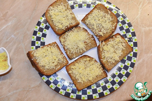 Натереть пармезан на мелкой терке и сверху посыпать гренки.