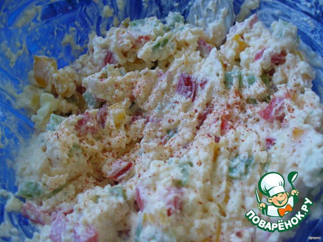 Плавленый сыр натереть на мелкой терке (предварительно его лучше положить в морозилку минут на 10 - удобней будет тереть). Вилкой тщательно перемешать сыр, перец, давленый чеснок, паприку, и, если добавляете, майонез.