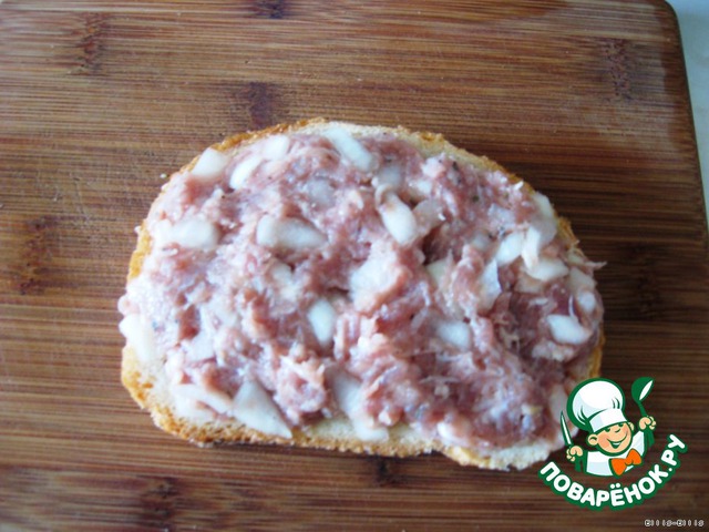 Берем ломтик хлеба и намазываем его фаршем. Толщина, где-то, 1 см или больше, на ваше усмотрение.